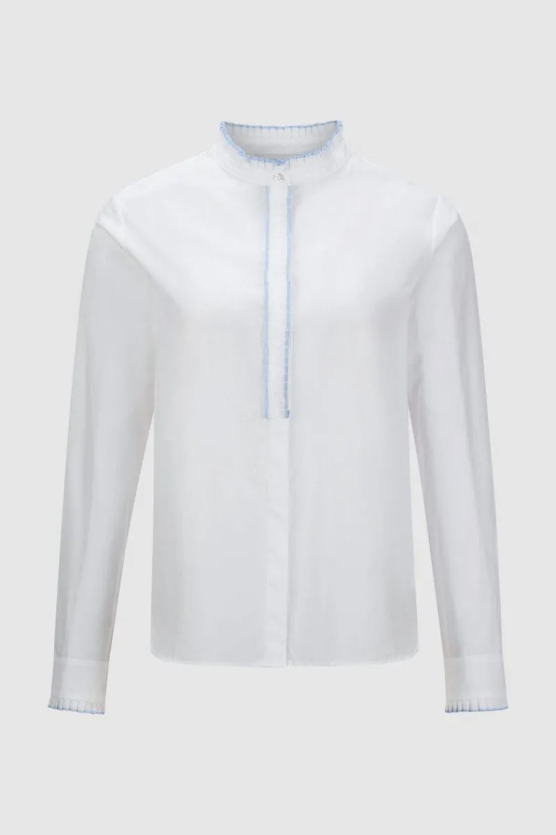 Romantisch verspielt besticht diese Bluse durch Stehkragen und Rüschenbesatz mit Kontrastfarben. Das klassische Oberteil besitzt eine verdeckte Knopfleiste sowie Manschettenärmel und überrascht im Rücken mit einer legeren Kellerfalte. Pluspunkte gewinnt die Bluse auch dank der komfortablen Bio-Baumwolle.