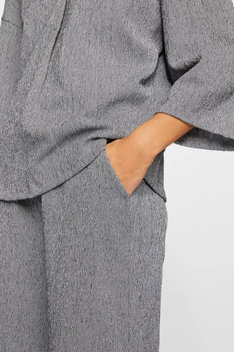 Das zweifarbige Kreppmaterial der Pants bringt ein ausdrucksstarkes Gesamtbild. Trendig präsentiert sich die Hose auch mit ihrem weiten Bein. Dank des Gummibundes und der Taschen trägt sie sich recht bequem.