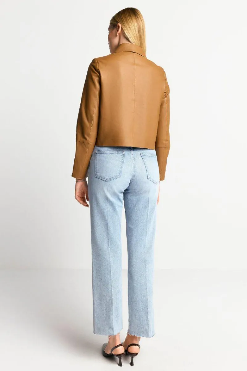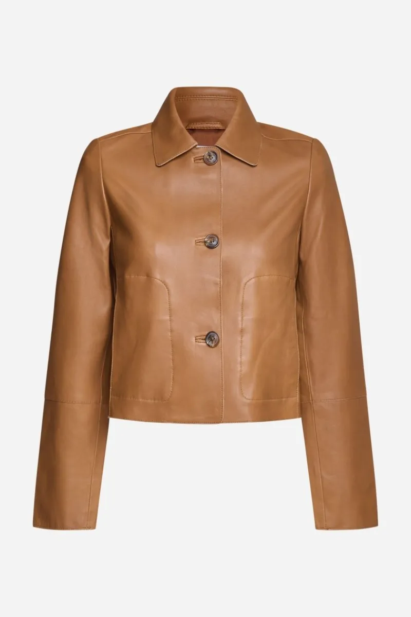 Diese kurze Lederjacke in sattem Karamellbraun kombiniert klassisches Design mit modernem Chic! Die hochwertige Verarbeitung aus glattem Leder, der stilvolle Kragen und die Knöpfe machen sie perfekt für urbane Looks.