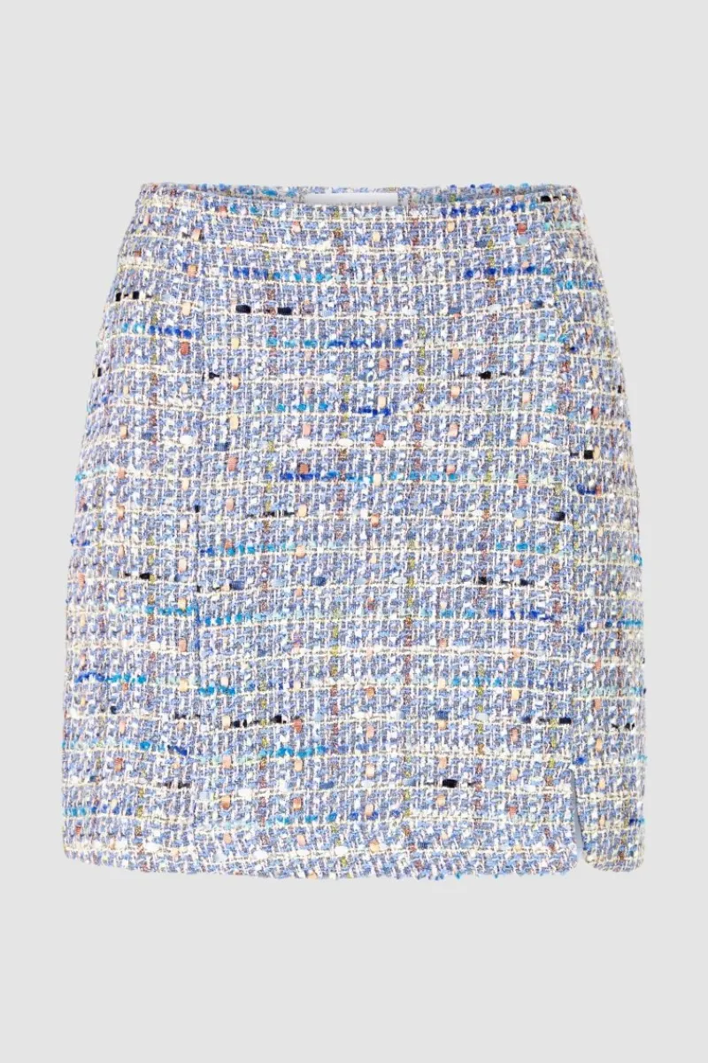 Der Minirock kommt im femininen Tailoring mit hohem Bund. Er besitzt einen seitlichen Reißverschluss und Schlitz auf der linken Seite. Der farbenfrohe Tweed mit Glanzgarn ist ein gelungener Blickfang.