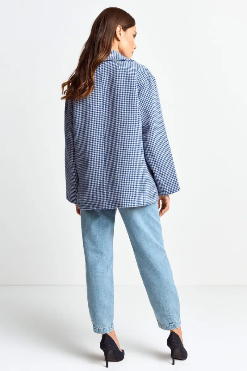 Diese Jacke in Blauweiß mit Hahnentrittmuster ist ein Must-have für die Übergangszeit! Die doppelte Knopfreihe, große Taschen und der Reverskragen sorgen für einen klassischen Look. Kombiniere sie mit Jeans und High Heels für einen modernen Look.
