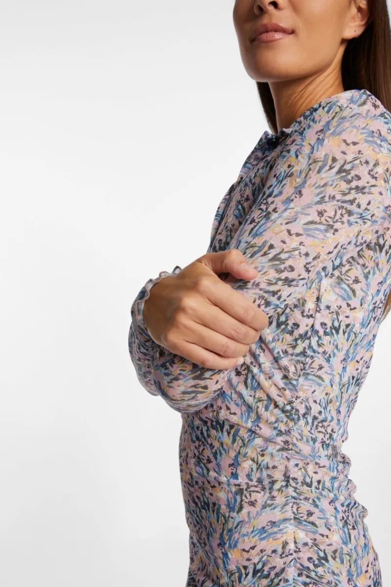 Ein klasse Trendteil ist dieses figurnah sitzende Polokleid aus recyceltem Mesh. Eyecatcher sind der blurry Flower-Print und der gesmokte Rock. Das Kleid kommt in Midilänge und besitzt im Vorderteil eine Knopfleiste.
