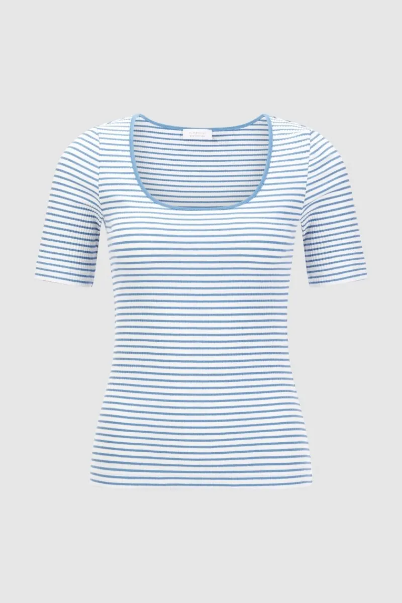 Maritim präsentiert dieses T-Shirt sporty Stripes. Für All-Day-Cozyness sorgt das Rippen-Design mit organischer Baumwolle. Das Shirt sitzt bodycon und hat einen Rundhals.