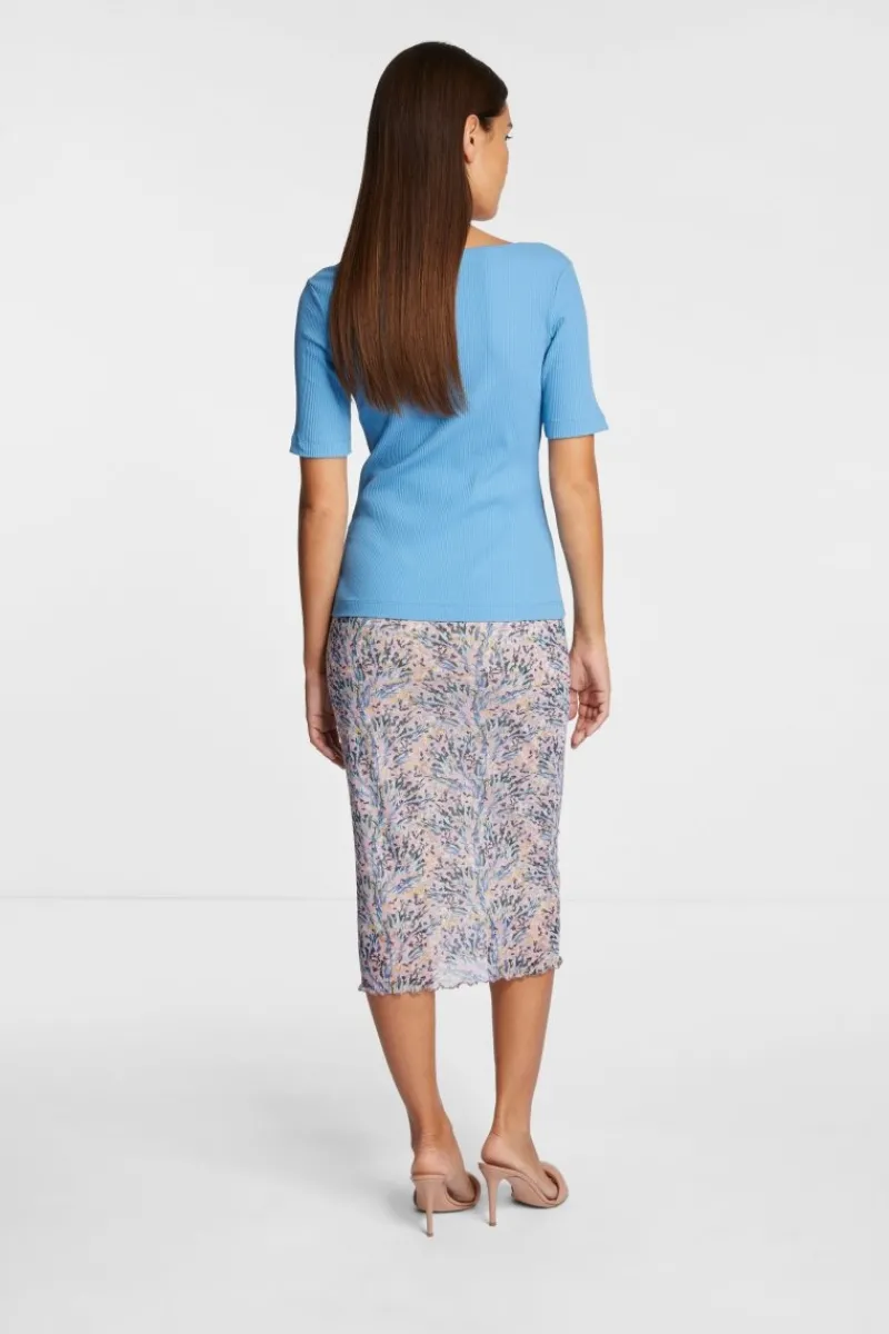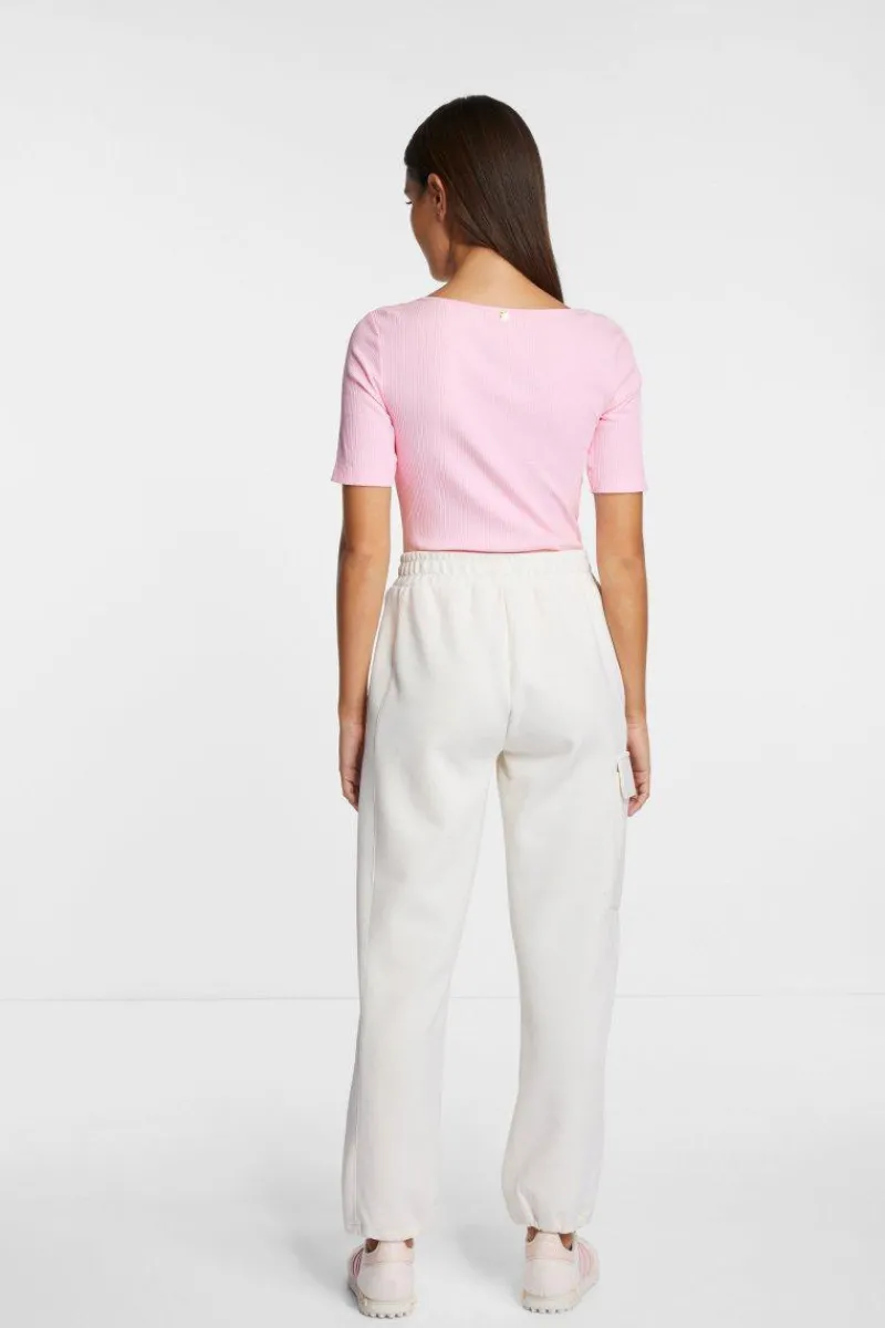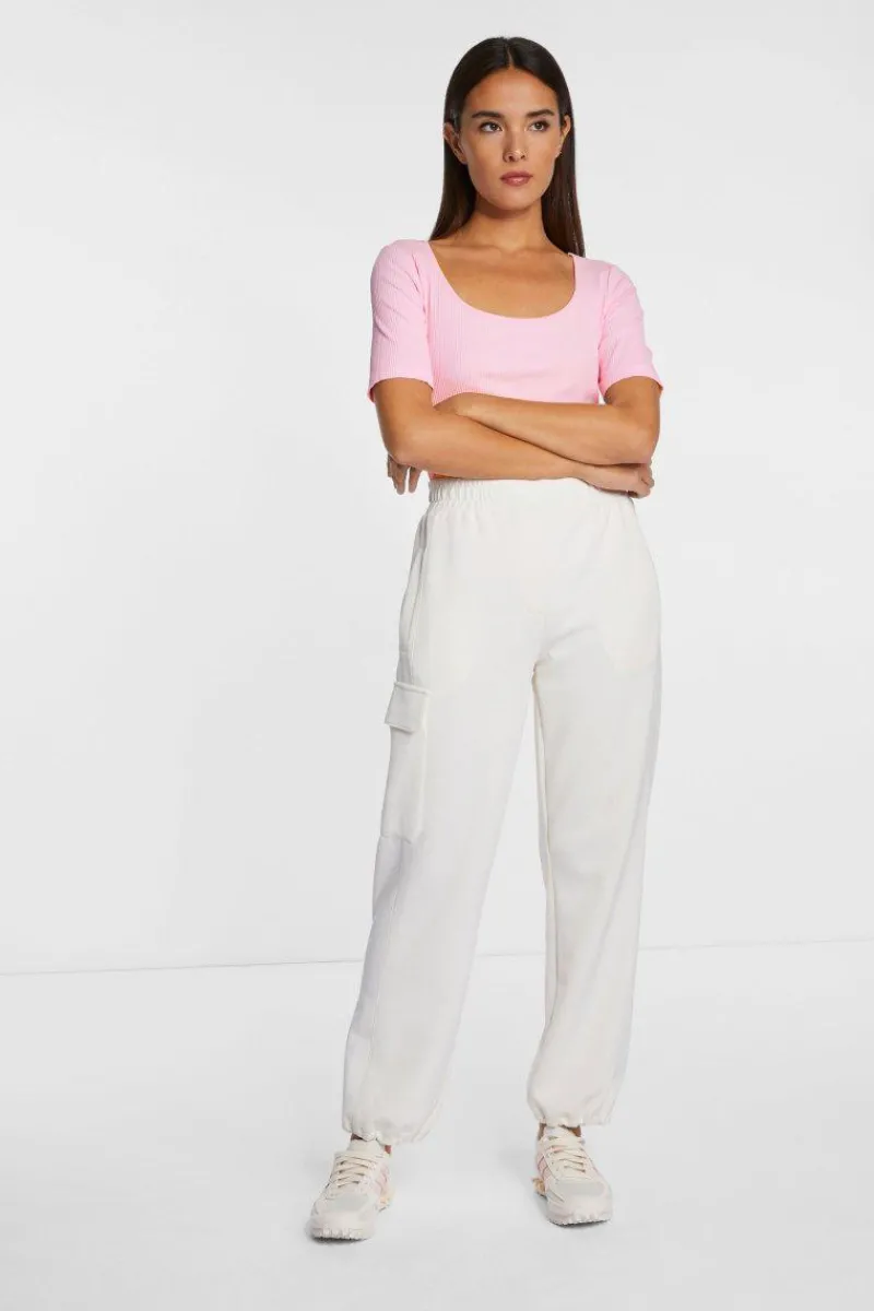 Dieses bodycon T-Shirt kommt in softer Rippenstruktur. Seine Bio-Baumwolle mit Elasthananteil trägt sich sehr bequem. Der weite Rundhals-Ausschnitt sorgt für chillige Summer-Vibes.
