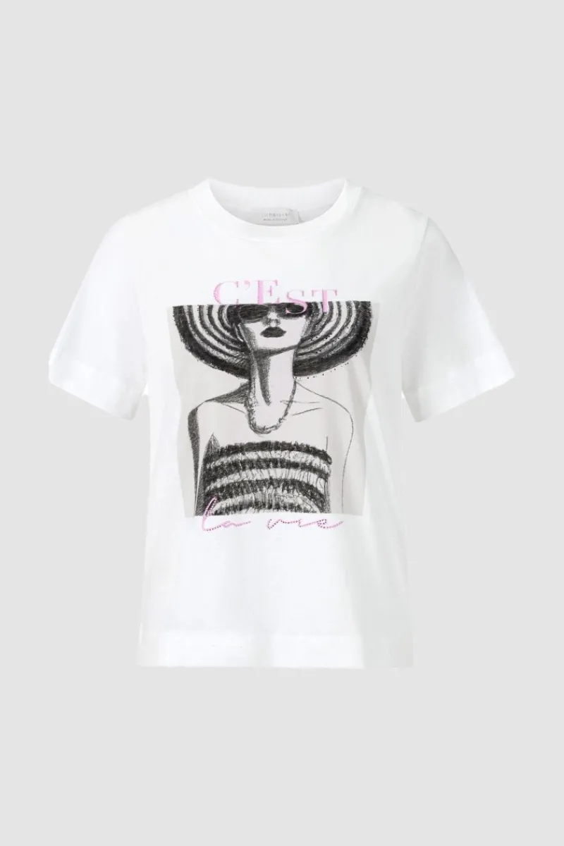 Glänzend präsentiert dieses T-Shirt ein strassunterlegtes „C´est la vie“-Statement. Im Blick steht auch der schwarz-weiße Woman-Print. Das Oberteil hat eine figurnahe Form und besteht zur Hälfte aus Bio-Baumwolle.